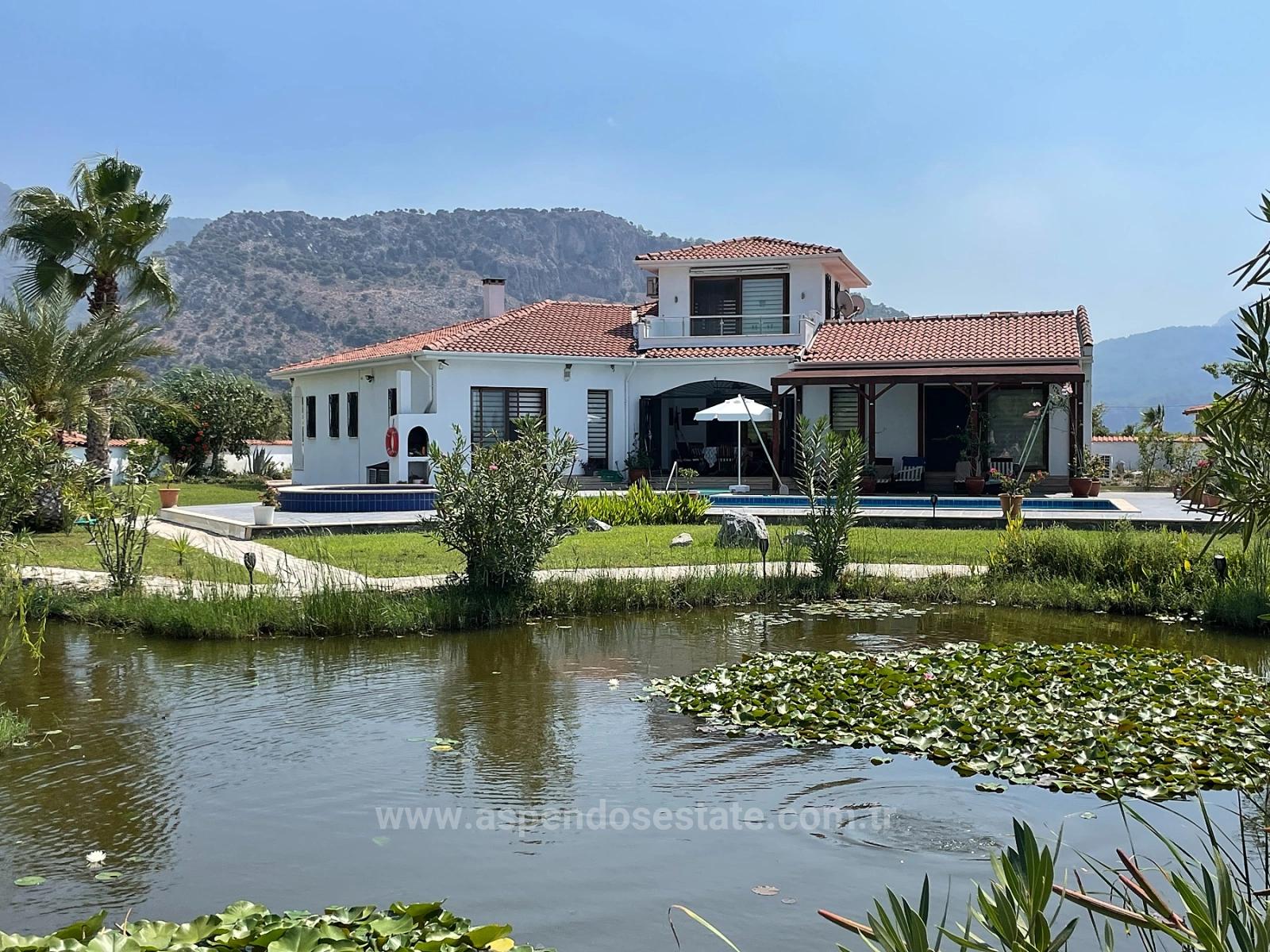 Dalyan İztuzu plaj yolu tarafında 7,000m2 arsa içerisinde 4 yatak odalı 1 salon şömüneli + mutfak bağımsız 4 banyolu full eşyalı herşey yenilenmiş her odanın kiliması vardır tüm beyez eşyaları yenidir. özel müstakil tuzlu su sistemli açık yüzme havuzlu ayrıca villanın önünde yapayı balıklı göl vardır. hahçe dizaynı yapılmı dişarıda bar bükü ve kamalya köşkü vardır. villanın geliş balkonu ve teraslıdır. hiç masrafı yoktur alış veriş ve sent pazarında 5 dk iztuzu plajına 8 km havaalanına 25 km mesafesi olan villa iztuzu ve kral mezarları manzaralıdır. fiyatı: 1,100,000GBP